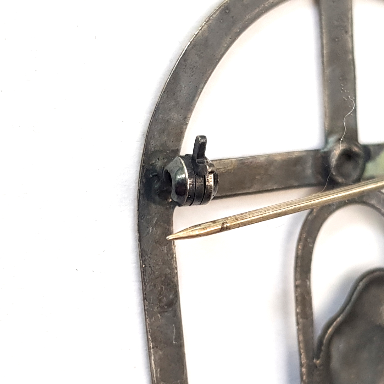 Wykonana z polerowanego metalu koloru antycznego srebra. Zapinana szpilką agrafki z blokadą.