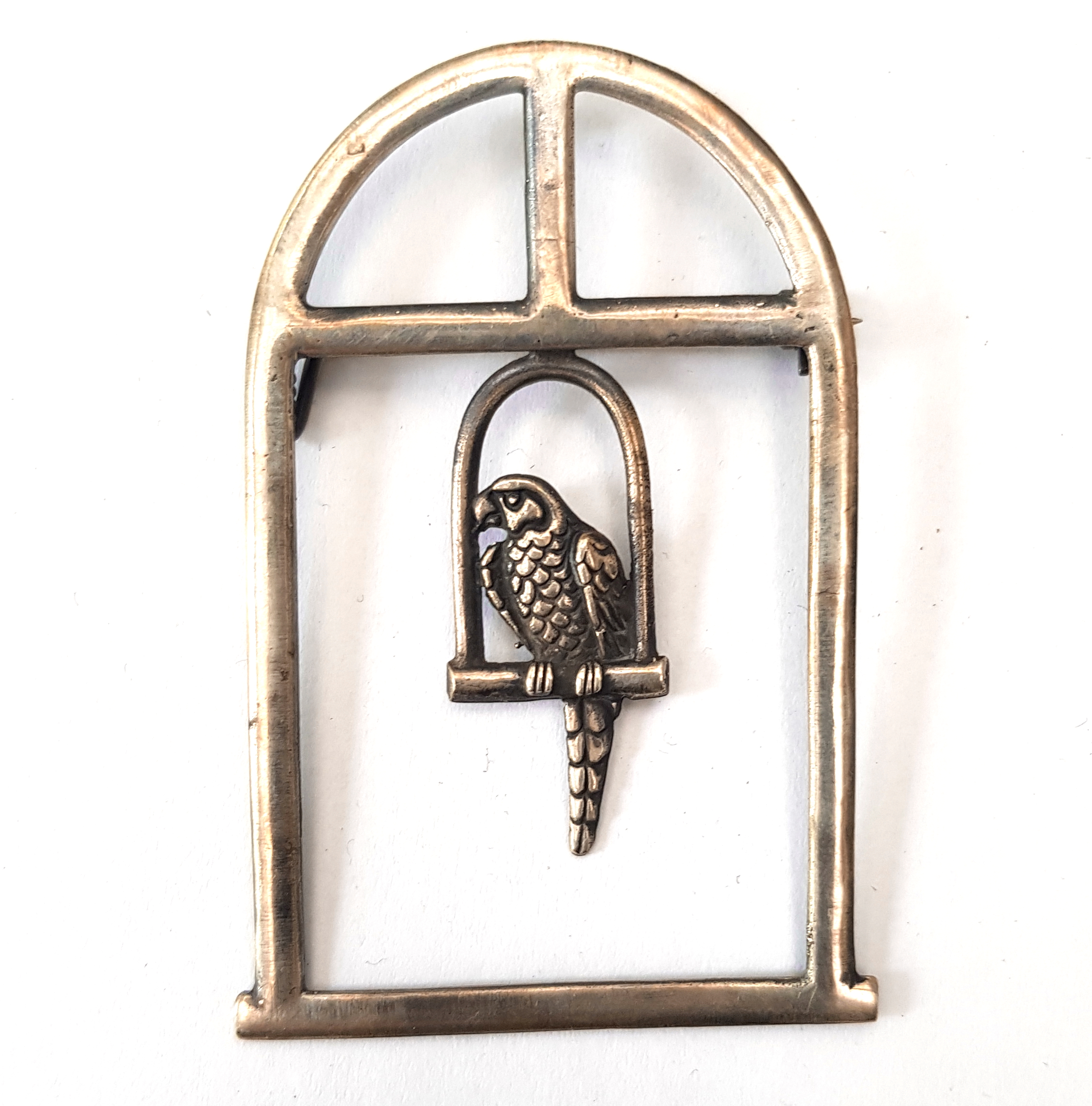 Oryginalna broszka damska w postaci papugi ary siedzącej w oknie na żerdzi huśtawki.