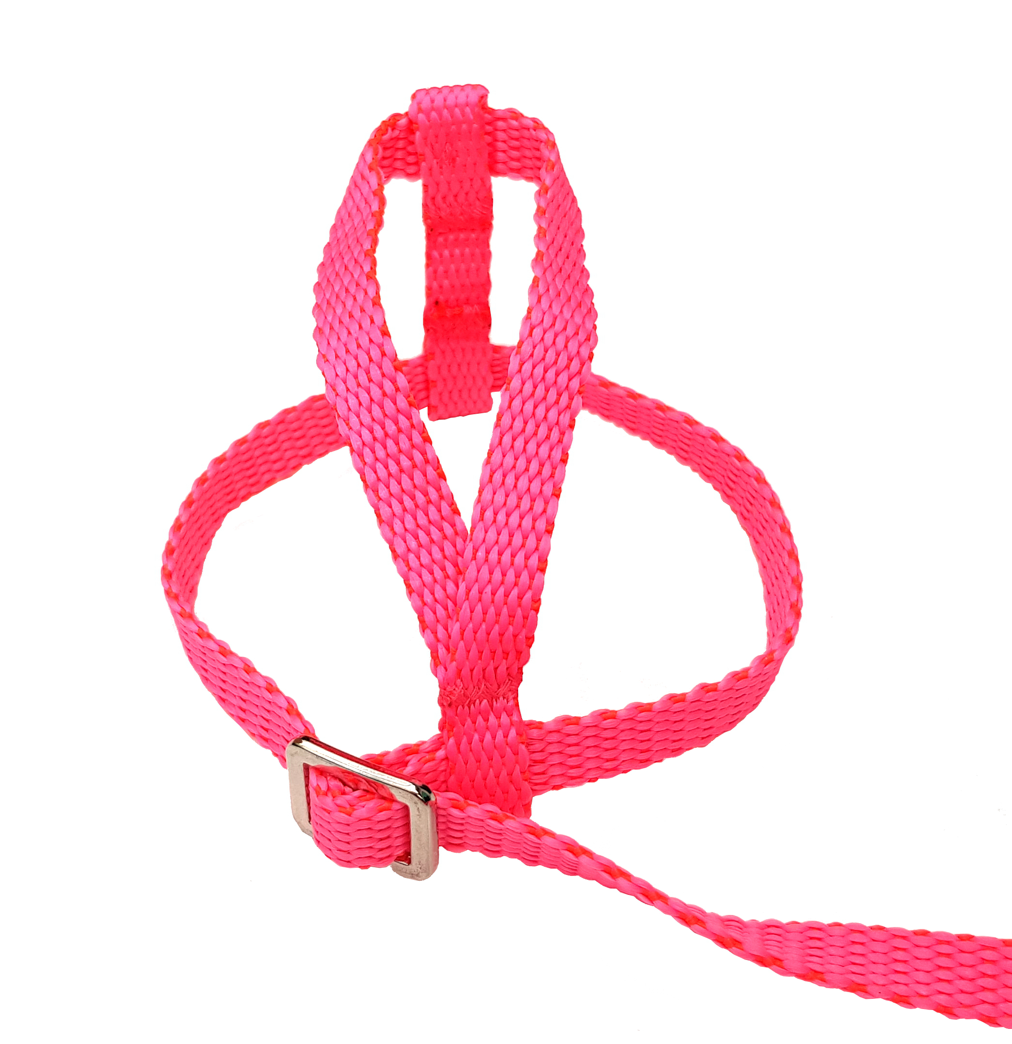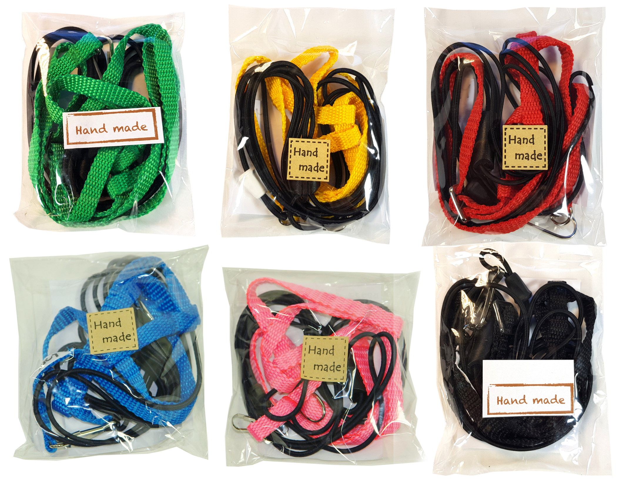 Szelki wykonane są z polipropylenu. Nie są klejone, lecz szyte. Metalowa sprzączka i czarne końcówki smyczy z tworzywa sztucznego.