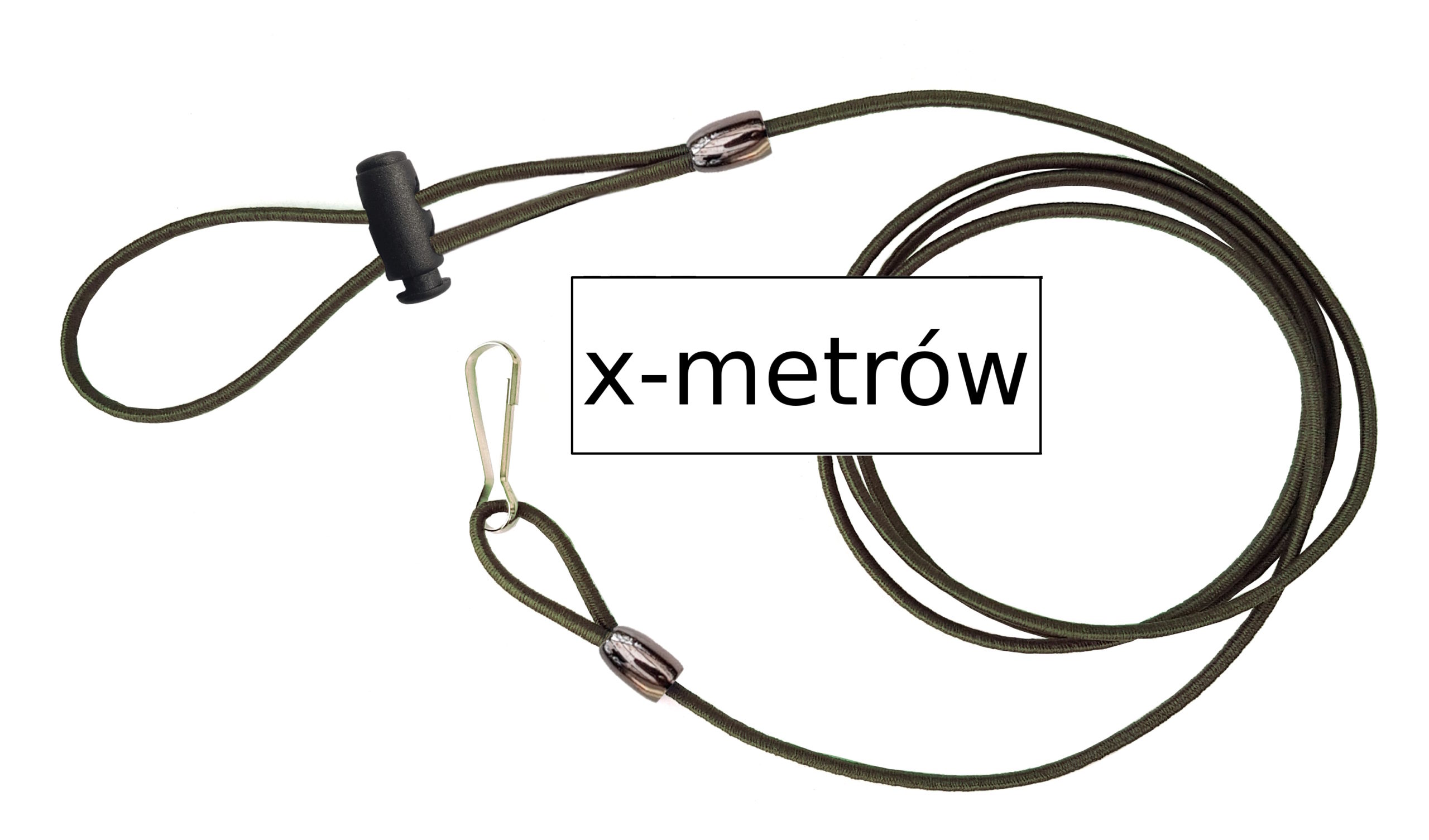 Pojedyncza elastyczna linka o długości ok. 1,5 m. Stoper z tworzywa sztucznego dwuotworowy. Metalowe końcówki w kolorze czarnym lub srebrnym różnych odcieni i kształtów, wysyłane losowo.